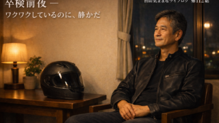 大型自動二輪教習、いよいよ卒検前夜。かつては試験前に身震いしていた自分が、今回は不思議なほど落ち着いている。焦りはない。あるのは静かなワクワク。積み上げてきた時間が心を整えてくれた夜の記録。