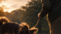 夕暮れの公園で芝生の上に伏せをして誇らしげに飼い主を見上げるロングコートチワワと、しゃがんで向き合う男性の後ろ姿。第118話「伏せは、偶然じゃなかった(そして布の上限定)」のアイキャッチ画像。 「日々とぬくもり」