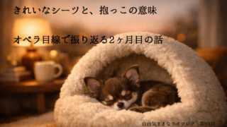 オペラを迎えて2ヶ月目。寒さ対策、ペットシーツのこだわり、ハイタッチの裏にあった「抱っこして」の気持ち。少しずつ家族になっていく日々をオペラ目線で綴ります。